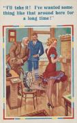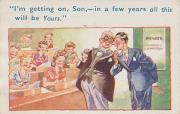 Illustrierte Postkarte; Grafik, polychrom; Nr. 6100 Rückseite: Büroszene; Vorgesetzter zeigt seinem Sohn das Sekretärinnenzimmer Vorderseite: beschrieben, adressiert; Briefmarke Postage Revenue (U.K.) 2 D; Poststempel Blackpool/3 Aug 1948