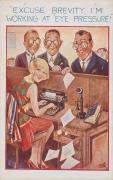 Illustrierte Postkarte; Grafik, polychrom; Comic Series Nr. 3240 Rückseite: Büroszene; Sekretärin mit Schreibmaschine, umgeben von männlichen Mitarbeitern Vorderseite: beschrieben; adressiert an Miss Oldham, Blackpool; Briefmarke Postage Revenue (U.K.) One Penny; Poststempel Hydecheshire/12 SP 1933