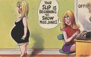 Illustrierte Postkarte; Grafik, polychrom; Bamforth Comic Series Nr. 519 Rückseite: Büroszene; schwangere Sekretärin in kurzem Kleid, weitere Sekretärin in kurzem Rock mit Schreibmaschine Vorderseite nicht beschrieben