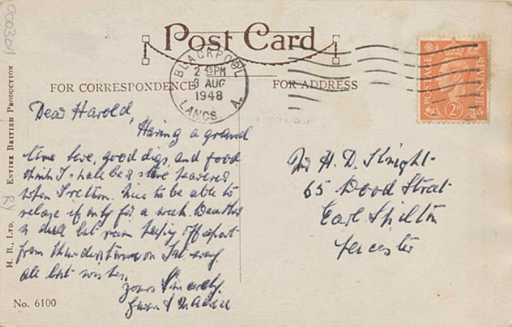 Illustrierte Postkarte; Grafik, polychrom; Nr. 6100 Rückseite: Büroszene; Vorgesetzter zeigt seinem Sohn das Sekretärinnenzimmer Vorderseite: beschrieben, adressiert; Briefmarke Postage Revenue (U.K.) 2 D; Poststempel Blackpool/3 Aug 1948