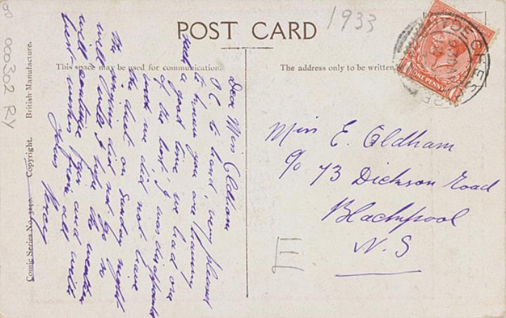 Illustrierte Postkarte; Grafik, polychrom; Comic Series Nr. 3240 Rückseite: Büroszene; Sekretärin mit Schreibmaschine, umgeben von männlichen Mitarbeitern Vorderseite: beschrieben; adressiert an Miss Oldham, Blackpool; Briefmarke Postage Revenue (U.K.) One Penny; Poststempel Hydecheshire/12 SP 1933