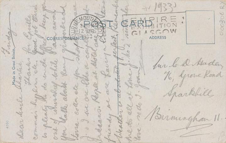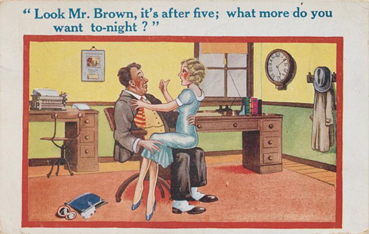 Illustrierte Postkarte; Grafik, polychrom; Nr. 4560 Rückseite: Büroszene; Sekretärin sitzt auf Schoß des Vorgesetzten Vorderseite: beschrieben, adressiert; Poststempel Bournemouth/12 Aug 1933