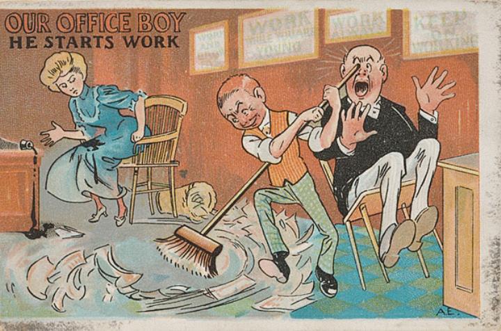 Illustrierte Postkarte; Grafik, polychrom Rückseite: Büroszene; Sekretärin, Vorgesetzter und Bürojunge Vorderseite beschrieben