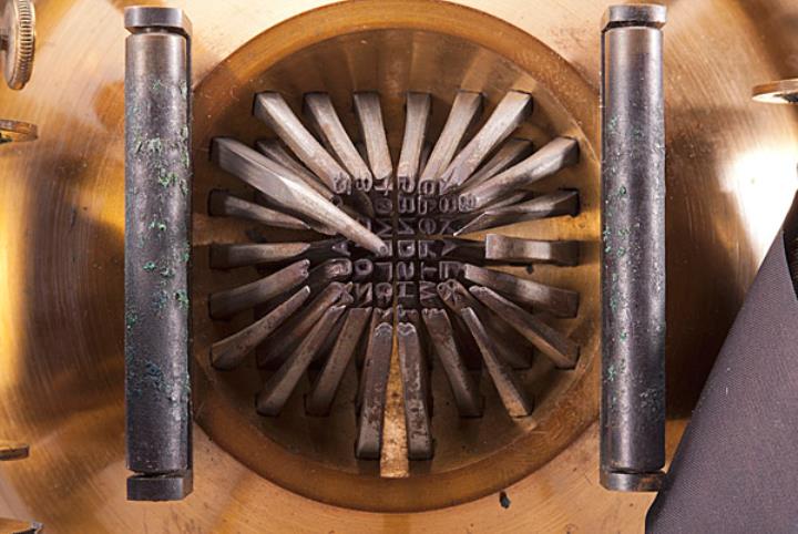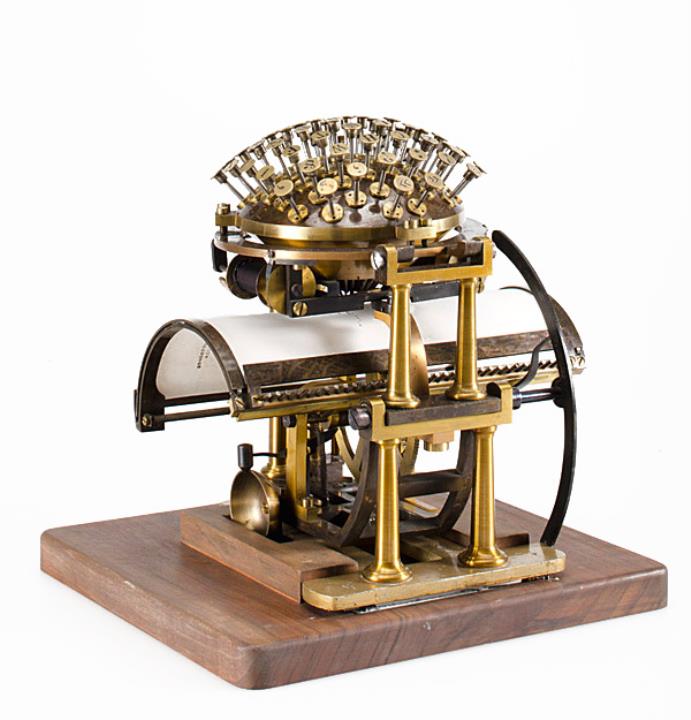 Schreibmaschine, Malling Hansen, Malling-Hansen, Hansen Hans Rasmus Malling Johan, Typenstangen, Typenstäbe, Oberanschlag, Farbband