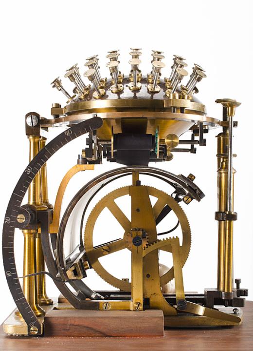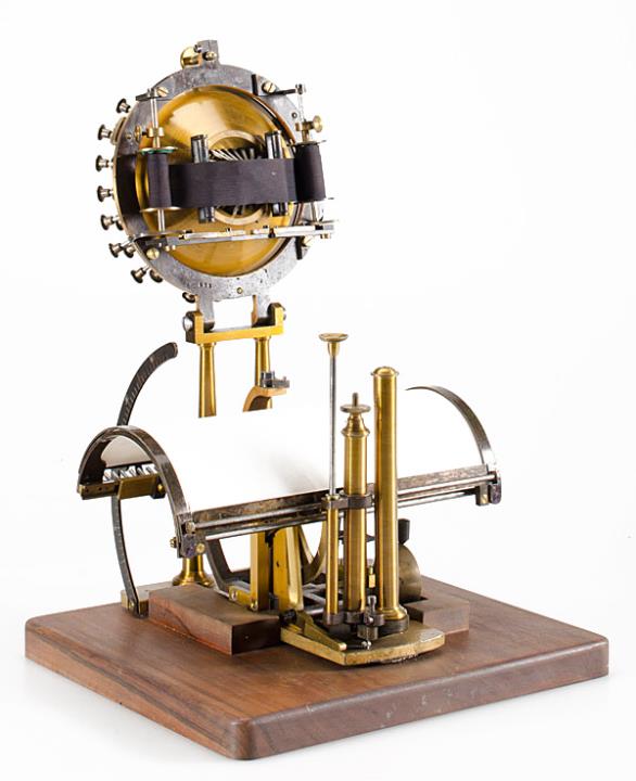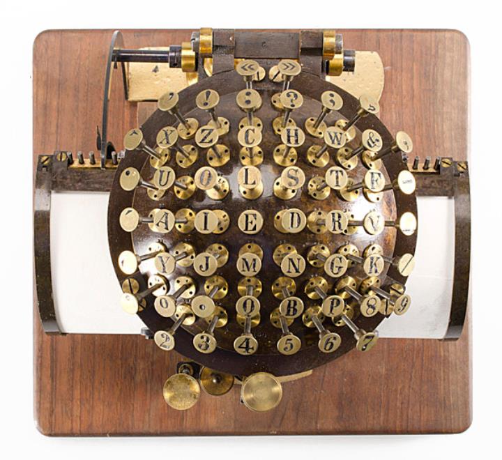 Schreibmaschine ("Schreibkugel") Malling Hansen mit Holzsockel Eigenschaften: Typenstäbe, Oberanschlag, Großbuchstaben, Farbband Tastatur: halbkugelförmig, ideal, 54 Schreibtasten Konstrukteur: Hans Rasmus Johan Malling Hansen Besonderheit: erste kommerziell gefertigte Schreibmaschine; ursprünglich als Schreibhilfe für Taubstumme erdacht; berühmtester Besitzer einer Schreibkugel war Friedrich W. Nietzsche, Seriennummer 150
