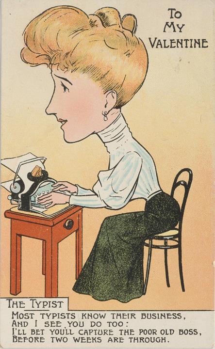 Illustrierte Postkarte; Grafik, polychrom; Valentine's Series Rückseite: Sekretärin mit Schreibmaschine, darunter Text in Versform Vorderseite nicht beschrieben