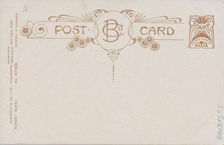 Illustrierte Postkarte; Grafik, polychrom; Songs Series Nr. 4719/3 Rückseite: Szene mit vier Büromitarbeitern, darunter Liedtext in Versform Vorderseite nicht beschrieben