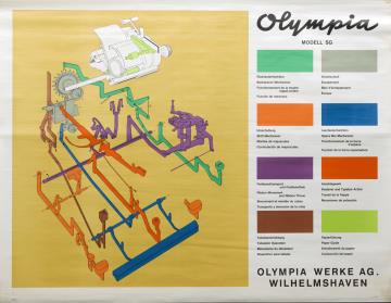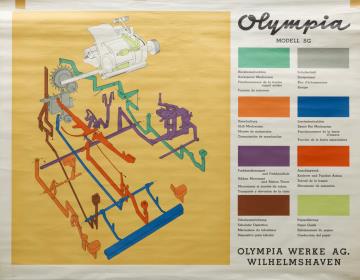 Aufrollbare Wandkarte mit Darstellungen von Schreibmaschinen Papier mit Baumwollgewebe verstärkt, mit Holzleisten und Aufhängeschnur