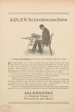 Prospekt für Schreibmaschine Adler mit Bein-Umschaltung (D.R.G.M.) zum Schreiben mit einer Hand. Für Kriegsteilnehmer [...]