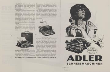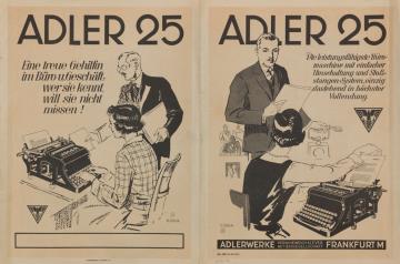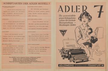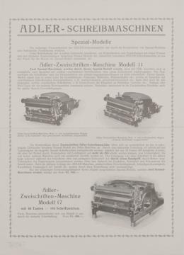 Prospekt für die Adler-Schreibmaschinen Spezial-Modelle: Adler-Zweischriften-Maschine Modell 11, Adler-Zweischriften-Maschine 17, Adler Modell 8 mit sofort auswechselbaren Schriftsätzen, Adler Modell 16 mit sofort auswechselbaren Schriftsätzen und Adler Mathematisch Modell 19.