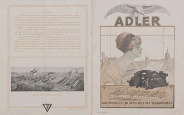 Prospekt bestehend aus Titelblatt und zwei Bildseiten (Schwarzweißfotografie der Königin, Abbildung des Bestell-Telegramms der Königin und Abbildung der Ehrenauszeichnung "Kgl. Preußische Staatsmedaille in Gold für gewerbliche Leistungen" an die Adlerwerke)