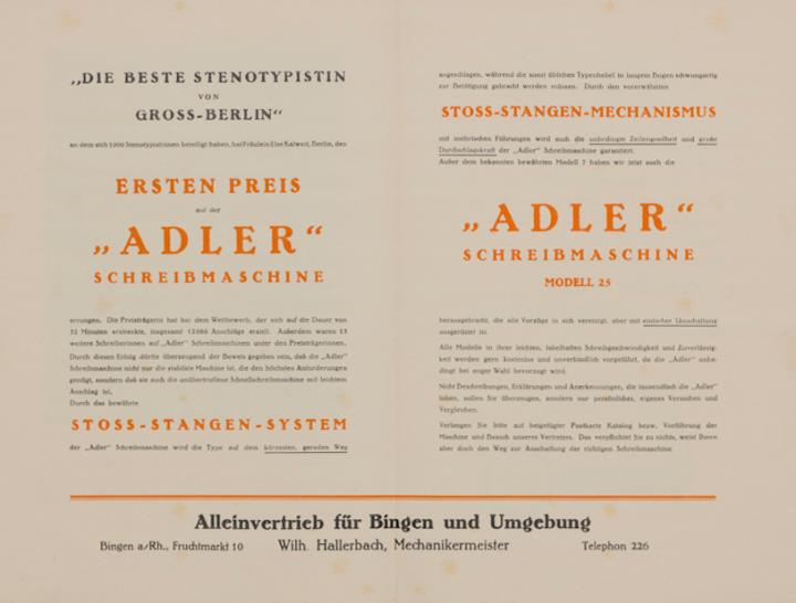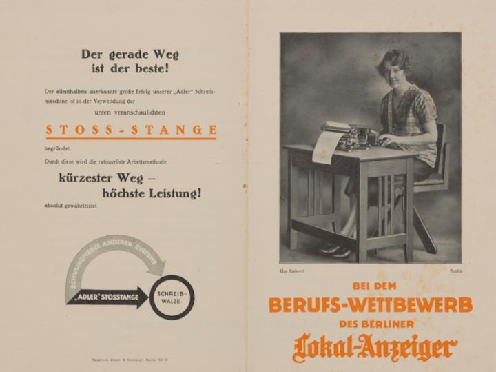 Prospekt zu einem Wettbewerb: "Die beste Stenotypistin von Gross-Berlin" an dem sich 1000 Stenotypistinnen beteiligt haben, hat Fräulein Else Kalweit, Berlin, den ersten Preis auf der "Adler" Schreibmaschine errungen