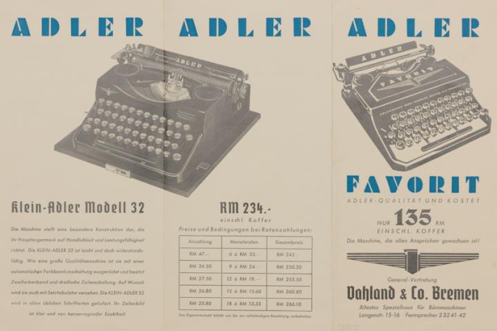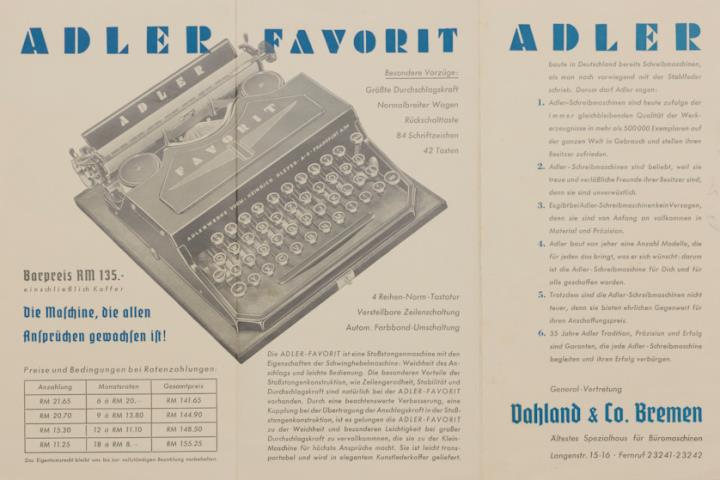 Prospekt der General Vertretung Vahland & Co. Bremen für Schreibmaschine Adler Favorit