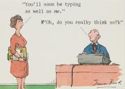 Illustrierte Postkarte; Grafik, polychrom; C 871 copyright 1986 Simon Bond Rückseite: Büroszene; Sekretärin und Mitarbeiter/Vorgesetzter mit elektrischer Schreibmaschine, weiterer Text: Oh, do you realky thimk so?k Vorderseite nicht beschrieben