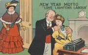 Illustrierte Postkarte; Grafik, polychrom; Series K.6 Rückseite: Büroszene; Vorgesetzter und Sekretärin mit Schreibmaschine, Ehefrau betritt den Raum Vorderseite: beschrieben; adressiert an Miss Pledger, London; Briefmarke Postage Revenue (U.K.) Half Penny; Poststempel London/Jan 7 1909