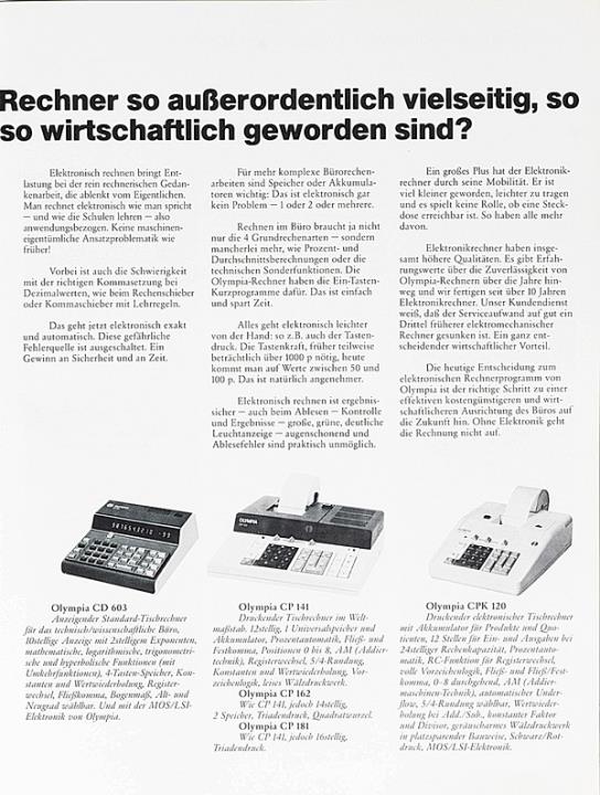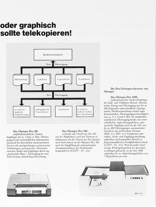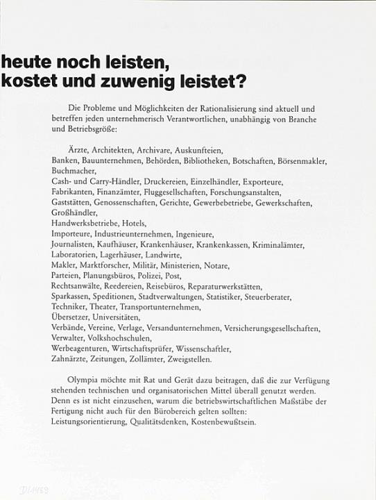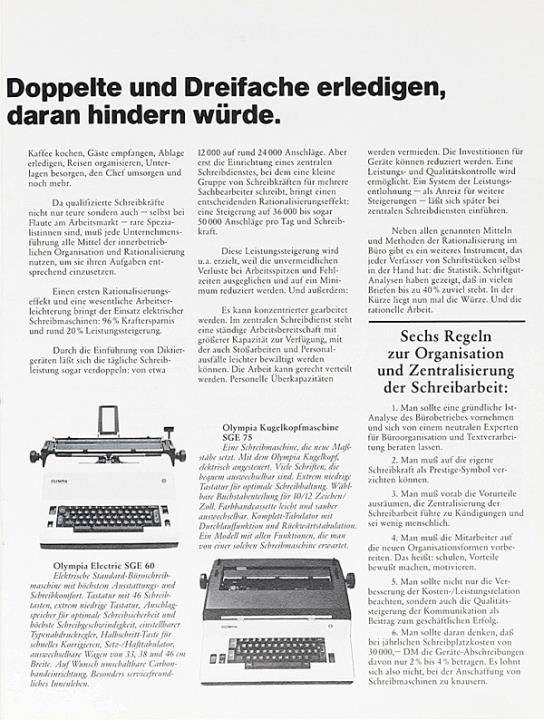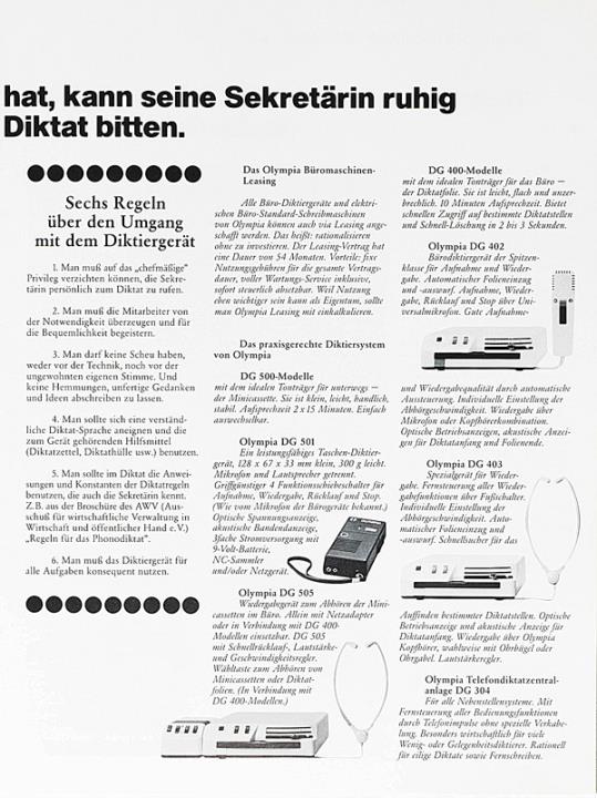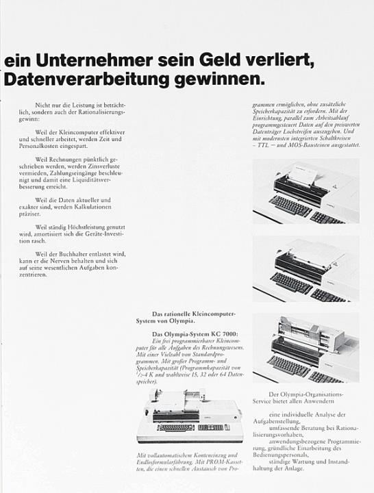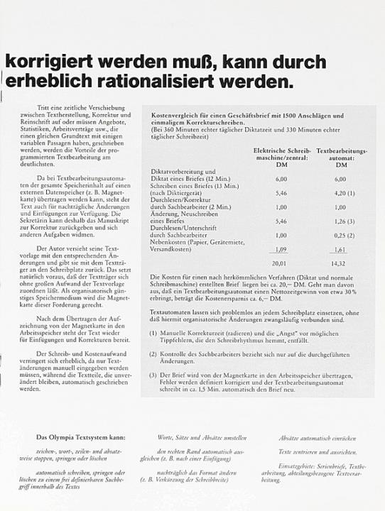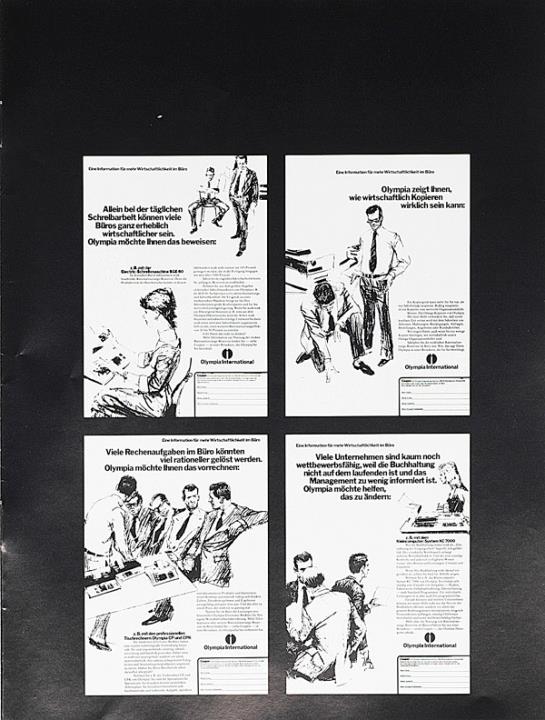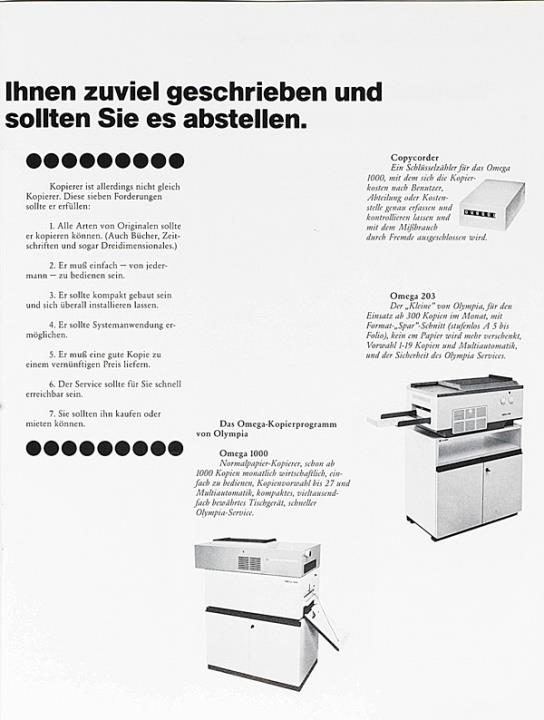 Prospekt für Schreibmaschine, Diktiergeräte und Kopierautomaten Olympia [...] wie Sie in Ihrem Büro die Kosten senken, die Leistung steigern und dabei auch die Arbeit erleichtern können. Nr. VWS 1314