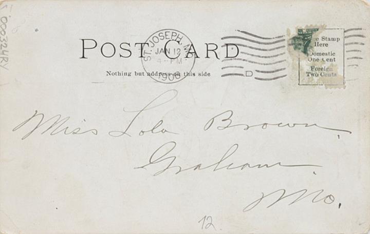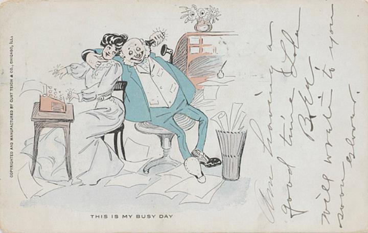 Illustrierte Postkarte; Grafik, polychrom; copyright Curt Teich & Co. Chicago Rückseite: Vorgesetzter und Sekretärin mit Schreibmaschine in romantischer Büroszene, Leerraum beschrieben Vorderseite: adressiert an Miss Brown, Graham; Poststempel St. Joseph/Jan 12 1906