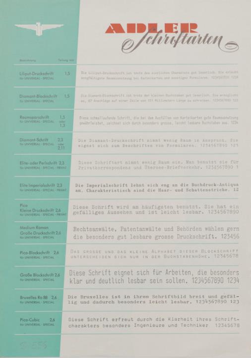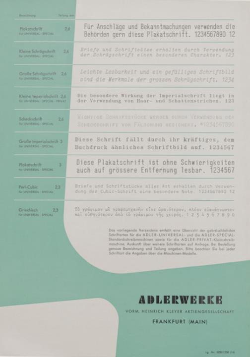 Prospekt mit allen angebotenen Schriftarten für Adler Schreibmaschinen Lg. Nr. 02502/258 (14)