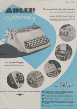 Prospekt für Adler Special. Die ausgereifte Standard-Schreibmaschine für anspruchsvolle Korrespondenz Datum handschriftlich vermerkt