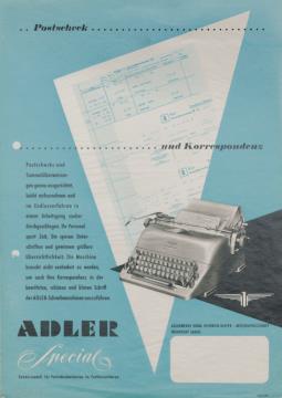 Prospekt für Schreibmaschine Adler Special. Sondermodell für Postscheckarbeiten im Endlosverfahren Nr. 25001/356