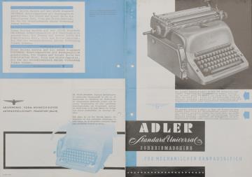 Prospekt für Schreibmaschine Adler Universal, Adler Special, Adler Privat. zwei Versionen, farblich wie grafisch verschieden, inhaltlich gleich; Nr. WS 4010/354 (blau) Nr. 01503/1055 (grün) Datum auf blauem Prospekt vermerkt