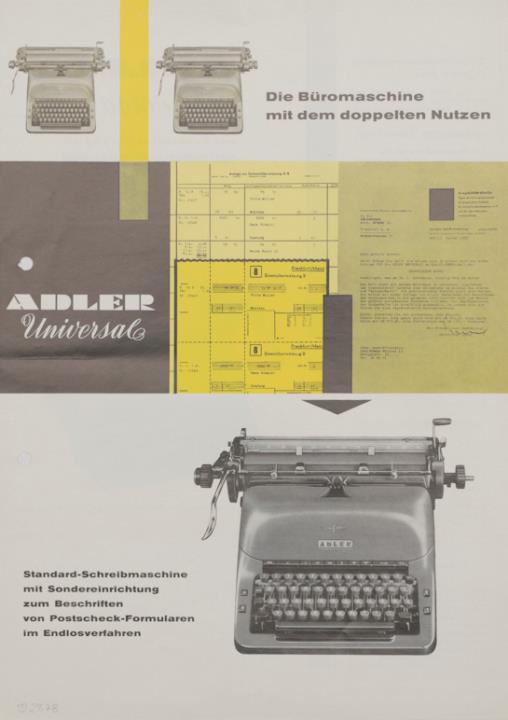 Prospekt für Schreibmaschine Adler Universal. Die Büromaschine mit dem doppelten Nutzen