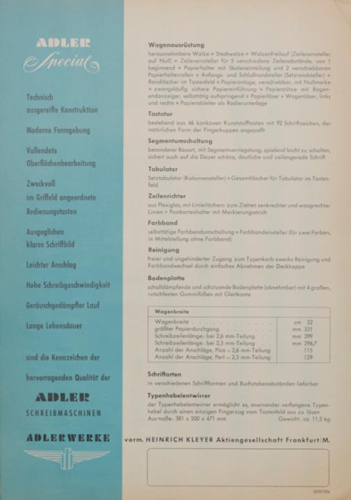 Prospekt für Schreibmaschine Adler Standard Special Nr. 20507/956