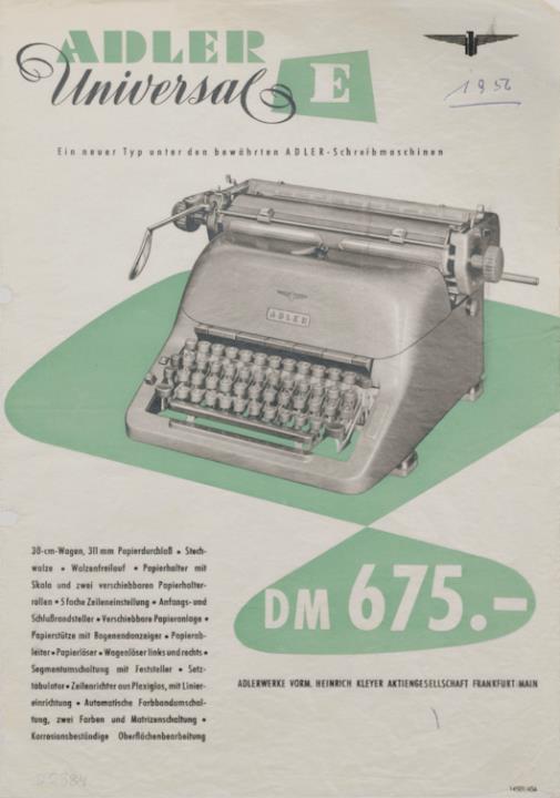 Prospekt für Schreibmaschine Adler Universal E. Ein neuer Typ unter den bewährten ADLER-Schreibmaschinen Nr. 14501/456 Datum handschriftlich vermerkt