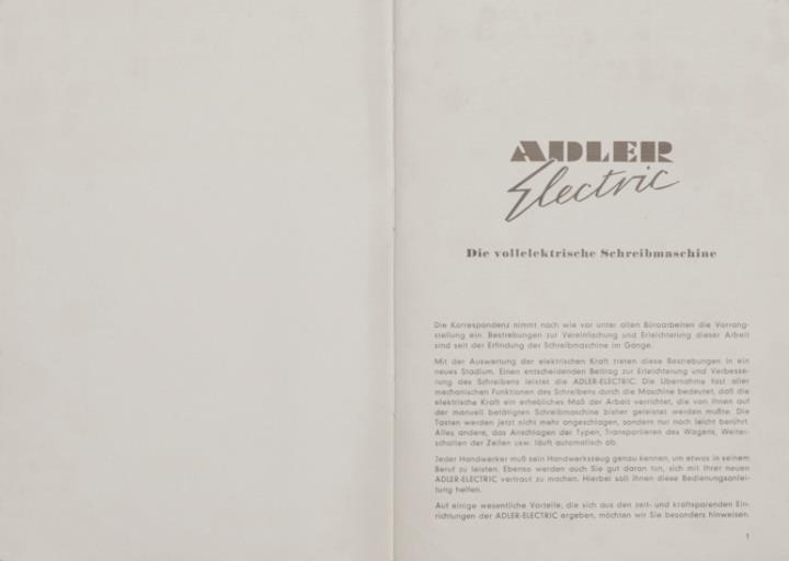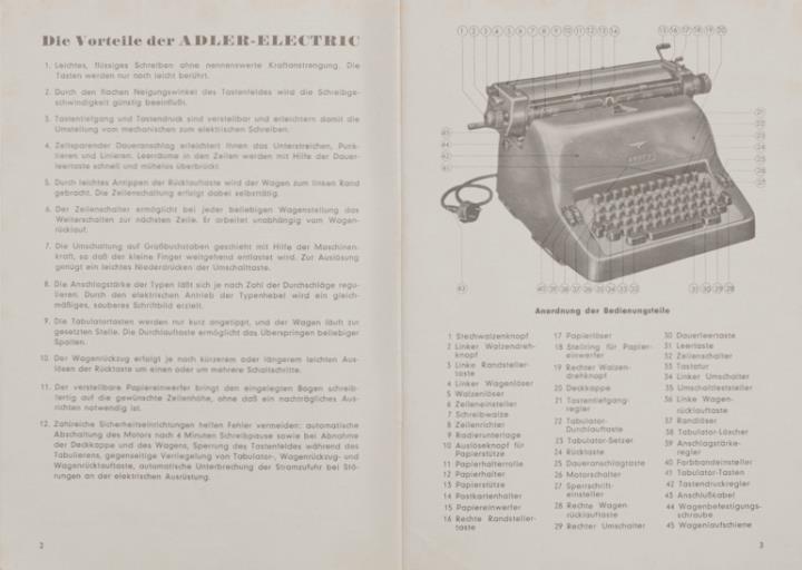 Bedienungsanleitung für Schreibmaschine Adler Electric. Ihre sachgemäße Bedienung und Pflege Jahreszahl handschriftlich auf dem Prospekt vermerkt