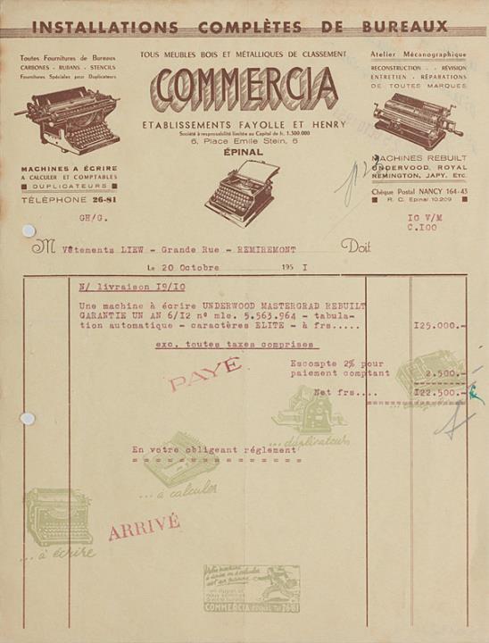 Rechnung der Bürowarenhandlung Commercia, Épinal adressiert an Vêtements Liew, Remiremont; datiert 20.10.1951 Maschinenschrift