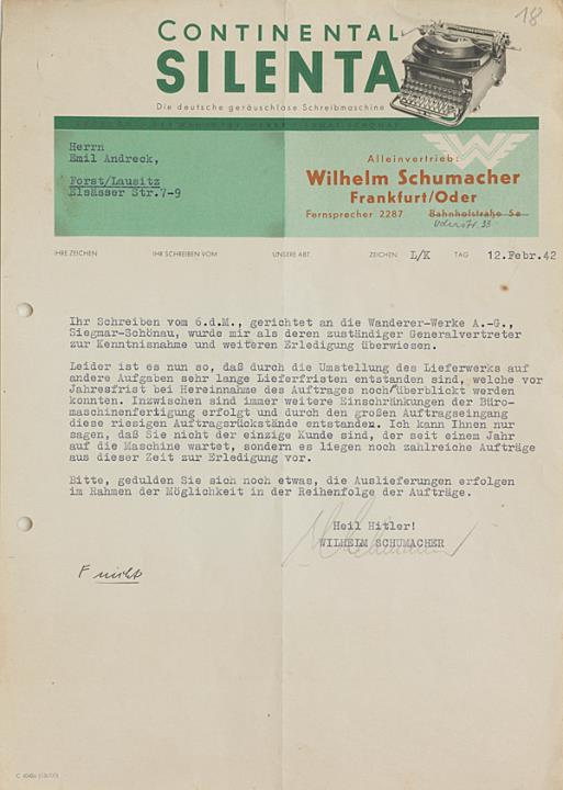 Brief der Schreibmaschinenhandlung Wilhelm Schumacher, Frankfurt/Oder adressiert an Herrn Andreck, Forst/Lausitz; datiert 12.02.1942 Maschinenschrift, unterschrieben