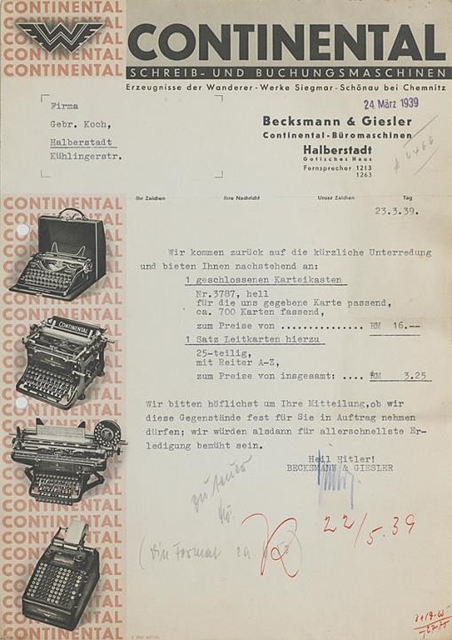 Brief der Schreibmaschinenhandlung Becksmann & Giesler, Halberstadt adressiert an Firma Gebr. Koch, Halberstadt; datiert 23.03.1939 Maschinenschrift, unterschrieben