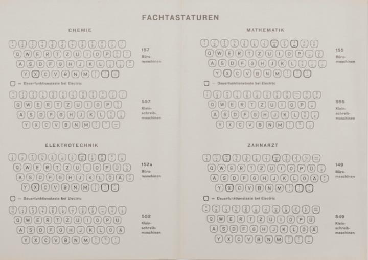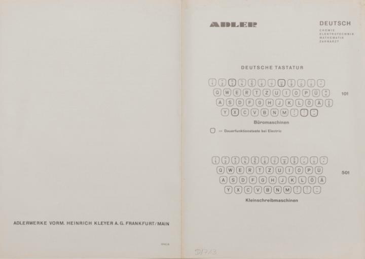 Faltprospekt mit Darstellung verschiedener Tastaturen der Adler Schreibmaschinen Nr. 1061/6