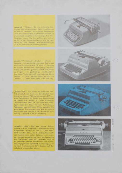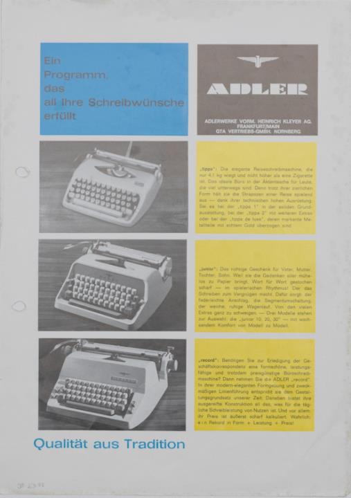 Prospekt für verschiedene Modelle der Adler Schreibmaschinen Ein Programm, das all Ihre Schreibwünsche erfüllt Nr. A 568/665/40