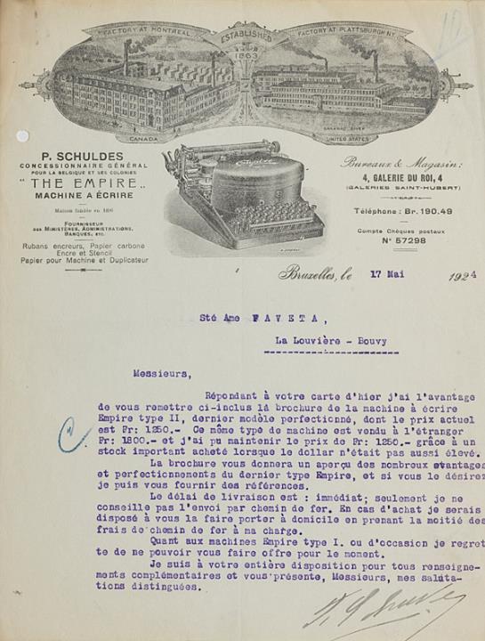 Brief der Schreibmaschinenhandlung P. Schulders, Bruxelles adressiert an Sté Ame Faveta, la Louvière-Bouvy; datiert 17.05.1924 Maschinenschrift, unterschrieben; Briefbogen mit Wasserzeichen "Empire Bond"