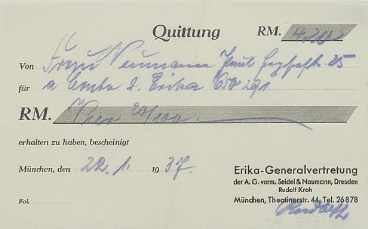Quittung der Schreibmaschinenhandlung Rudolf Kroh, München ausgestellt auf Frau Neumann, München; datiert 22.01.1937 Handschrift
