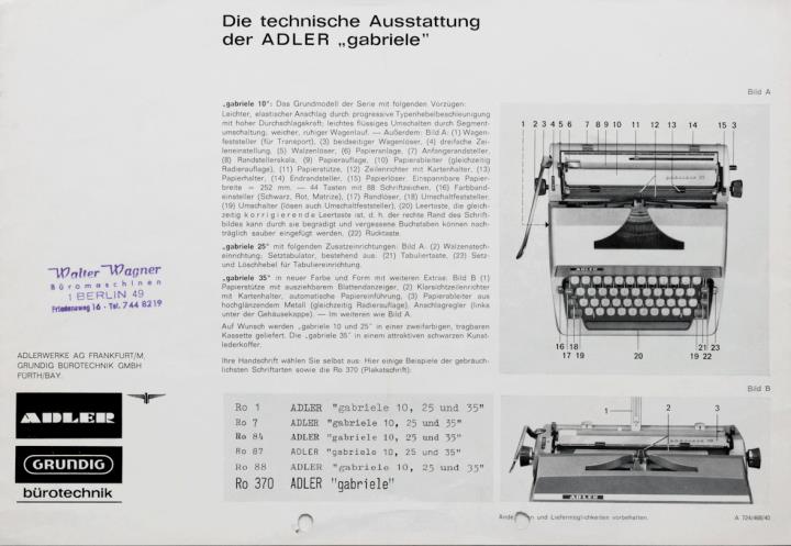 Faltprospekt für Schreibmaschine Adler Gabriele Nr. A 824/468/40