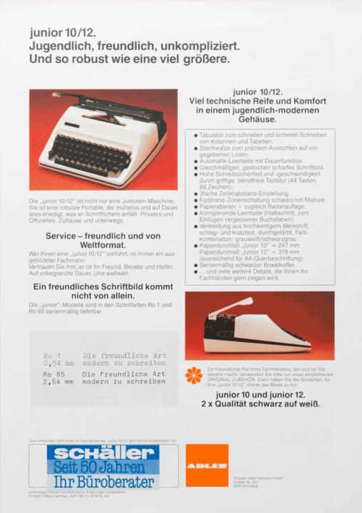 Prospekt für Schreibmaschine Adler junior 10/12 Die freundliche Art, schöner zu schreiben. Von Anfang an mit viel Komfort. Nr. A 01.03.01./679/50./40