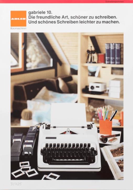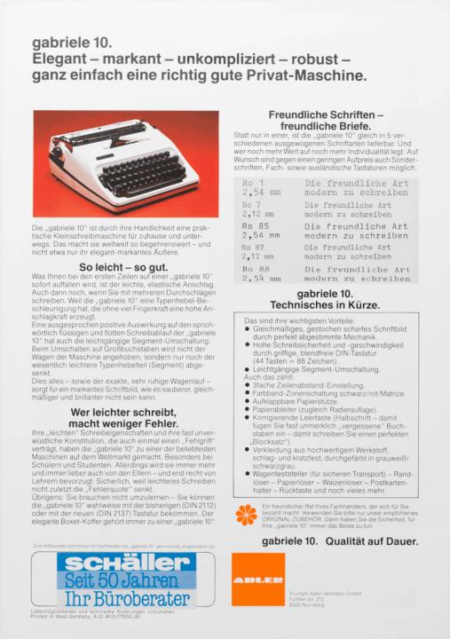 Prospekt für Schreibmaschine Adler gabriele 10. Die freundliche Art, schöner zu schreiben. Und schönes Schreiben leichter zu machen. Nr. A 01.44.01/779/50./40