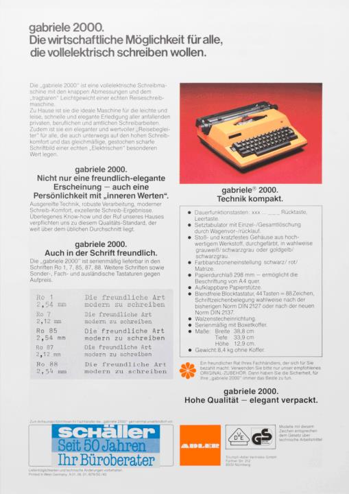 Prospekt für Schreibmaschine Adler gabriele 2000. Die freundliche Art, schöner zu schreiben. Vollelektrisch - und echt "portable". Nr. A 01.06.01./679/50./40