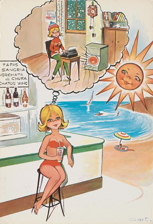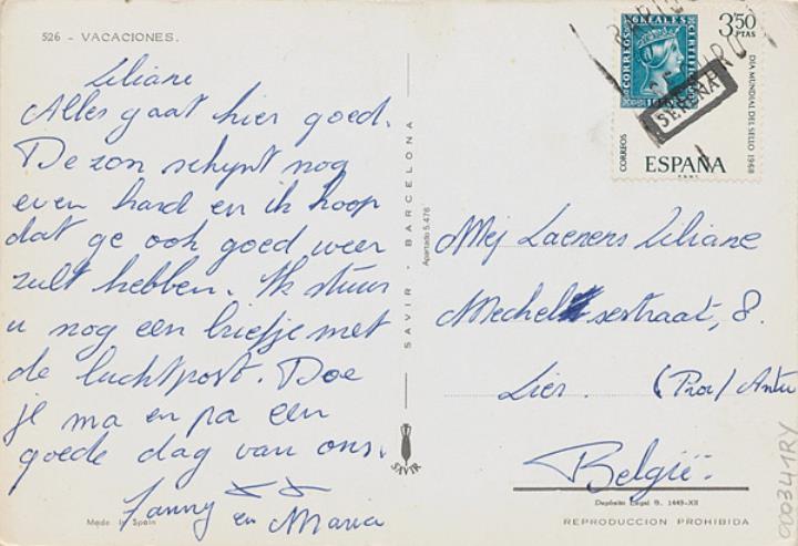 Illustrierte Postkarte; Grafik, polychrom; Nr. 526 Rückseite: Sekretärin im Büro mit Schreibmaschine (Rundbild) und im Urlaub am Strand Vorderseite: beschrieben; adressiert an Mej Laeners, Lier; Briefmarke Correos Espana 3.50 Ptas