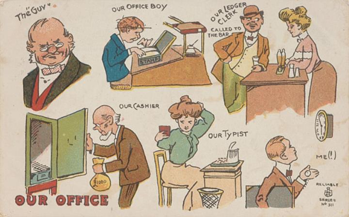 Illustrierte Postkarte; Grafik, polychrom; Reliable Series Nr. 311 Rückseite: Darstellung verschiedener Büroberufe Vorderseite: beschrieben, adressiert; Briefmarke New Zealand One Penny; Poststempel unleserlich