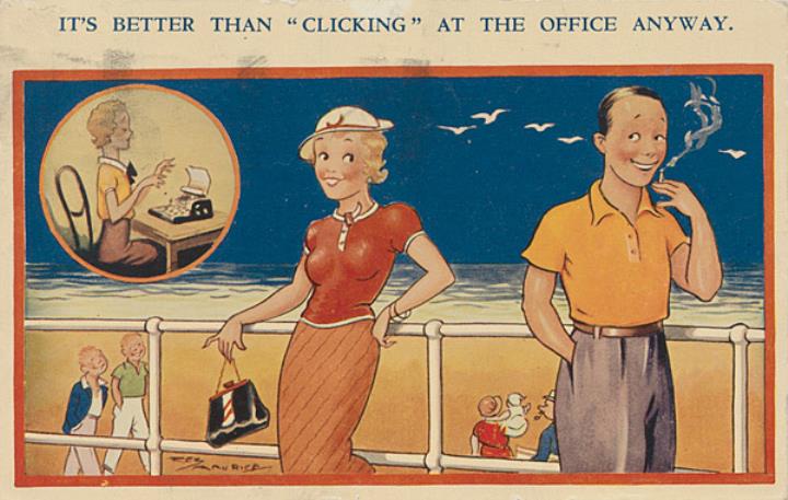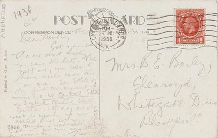 Illustrierte Postkarte; Grafik, polychrom; Nr. 2806 Rückseite: Sekretärin mit Schreibmaschine (Rundbild) und beim Spazieren entlang der Strandpromenade Vorderseite: beschrieben, adressiert an Mrs. Bailey; Briefmarke Postage Revenue (U.K.) One Penny; Poststempel Blackpool/25 Jne 1936