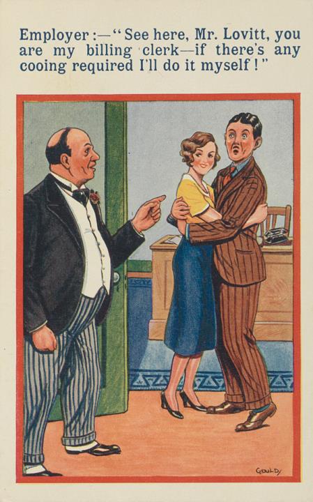Illustrierte Postkarte; Grafik, polychrom; XL Series Nr. 3711 V, Grafik: Gould Rückseite: Büroszene; Sekretärin und Mitarbeiter als Paar, Vorgesetzter betritt den Raum Vorderseite nicht beschrieben
