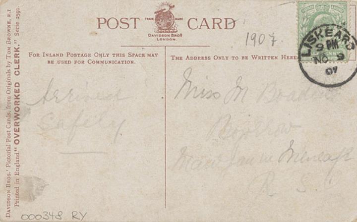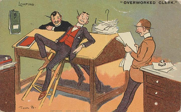 Illustrierte Postkarte; Grafik, polychrom; Serie Nr. 2590 Rückseite: Büroszene; drei Mitarbeiter beim Nichtstun und Zeitunglesen Vorderseite: beschrieben, adressiert; Briefmarke Postage Revenue (U.K.); Poststempel Liskeard/No. 9 1907