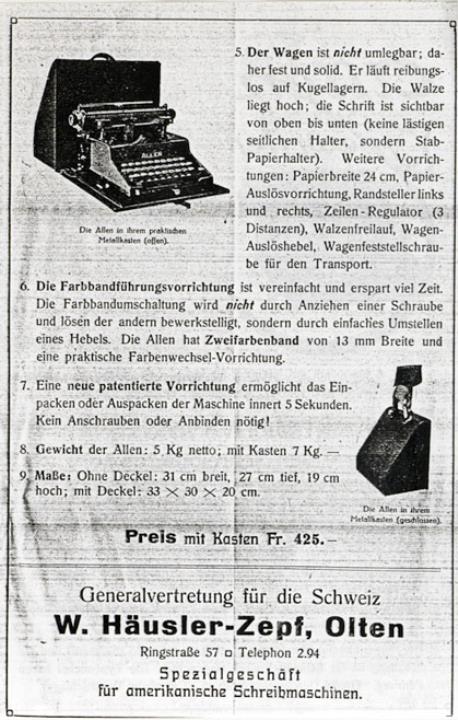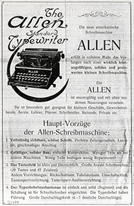 Prospekt für Schreibmaschine The Allen Standard Typewriter