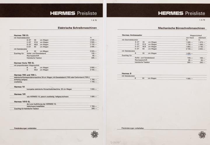 Preisliste für mechanische Büroschreibmaschinen und elektrische Schreibmaschinen Hermes Stand 01.09.1975