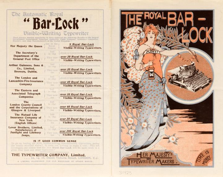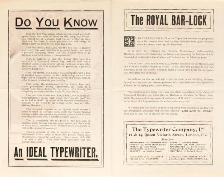 Faltprospekt für Schreibmaschine Royal Bar-Lock Her Majesty's Typewriter Makers