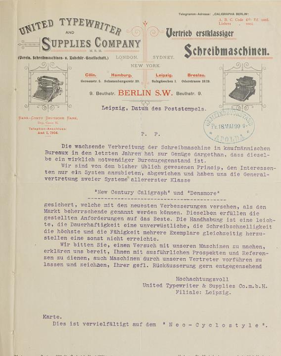 Rundschreiben der United Typewriter & Supplies Co.mbH, Leipzig; datiert 18.05.1899 Maschinenschrift