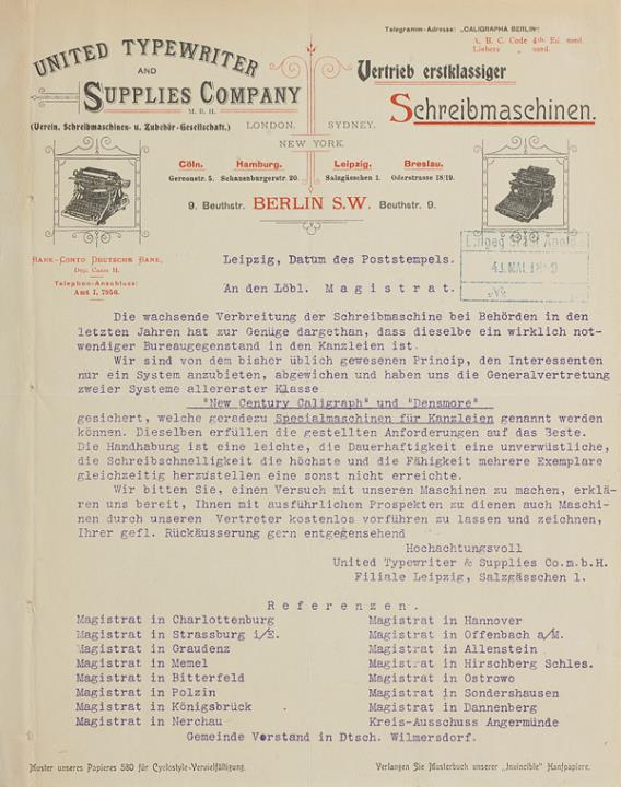Brief der United Typewriter & Supplies Co.mbH, Leipzig adressiert an Magistrat von Apolda; datiert 04.05.1889 Maschinenschrift